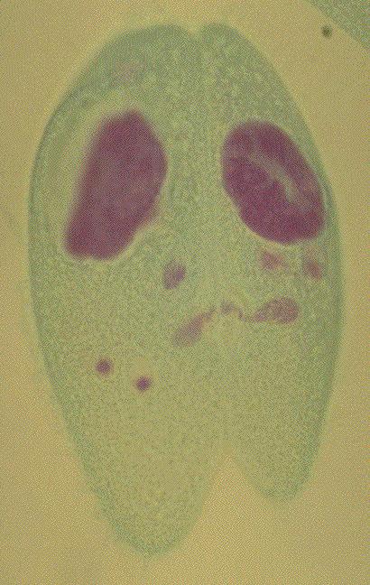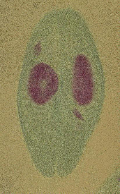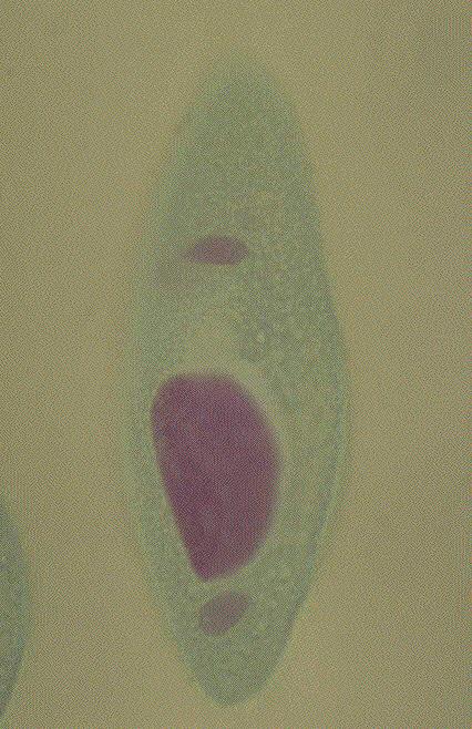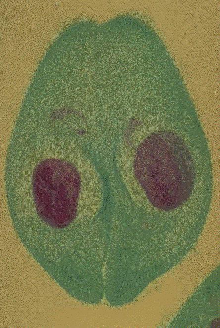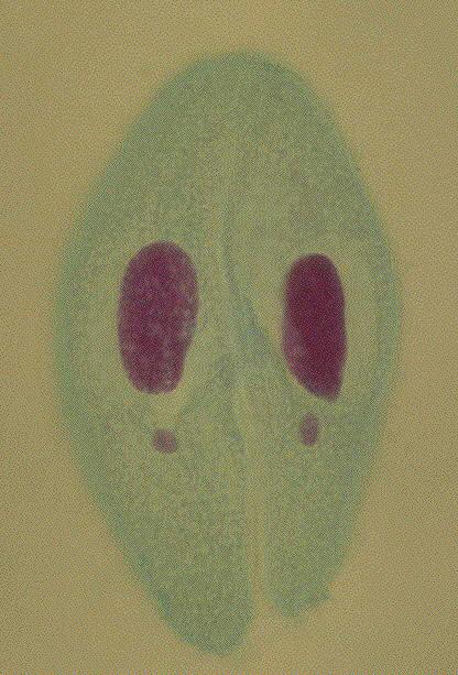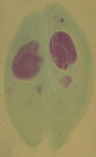 57.ゾウリムシ(Paramecium caudatum):接合、フォイルゲンーファーストグリーン二重染色