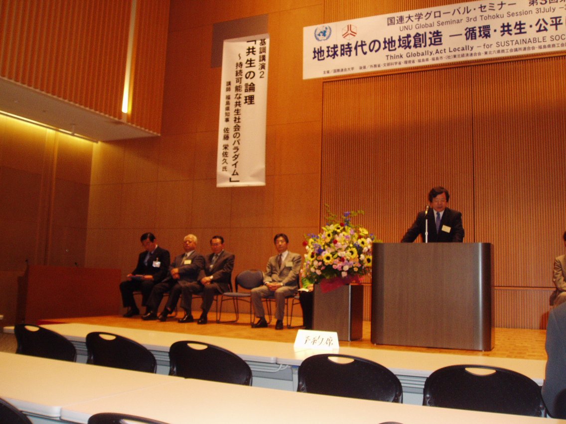 標記セミナーには、一回目仙台、二回目秋田そして今回の福島と毎回公開の部に参加してきました。 国際教養大学副学長のグレゴリー・クラーク先生のお話で、 ・昔の日本人は自然との共生が上手だった。 ・外国や背景に対して関心が薄い。 ・幅広く物を考えることが必要 が印象に残った。 また、佐藤栄佐久福島県知事からは ”他人の犠牲の下に成り立つ1人勝ち社会ではなく共生社会へ”、 ”事上磨連”等の話がなされた。