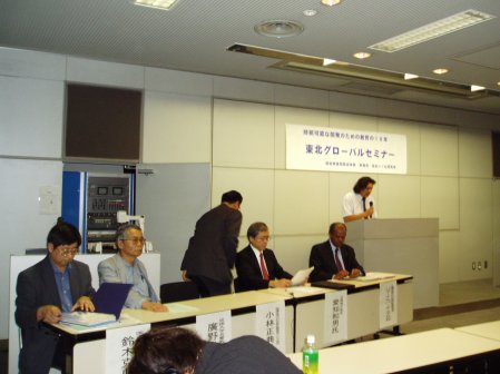 宮城教育大学小金沢孝昭教授とゲストの皆様国連砂漠化対処条約事務局長 Hama Arba Diallo氏 〃 事務局アジア担当 小林 正典氏 成蹊大学名誉教授 廣野 良吉氏 国連大学高等研究所上席客員研究員 鈴木 克徳氏 元環境庁長官 愛知 和男氏 セミナー風景