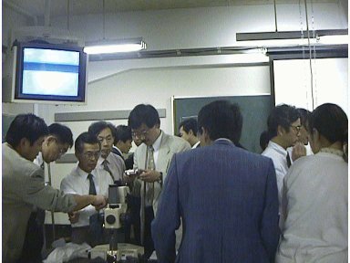 電子顕微鏡にデジタルカメラをセットし、サイバー図鑑に登録画像撮影風景